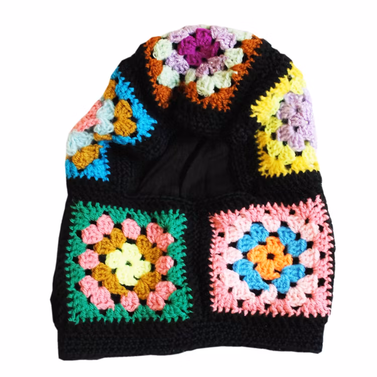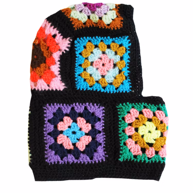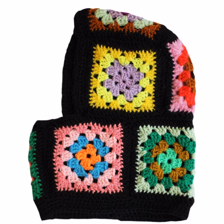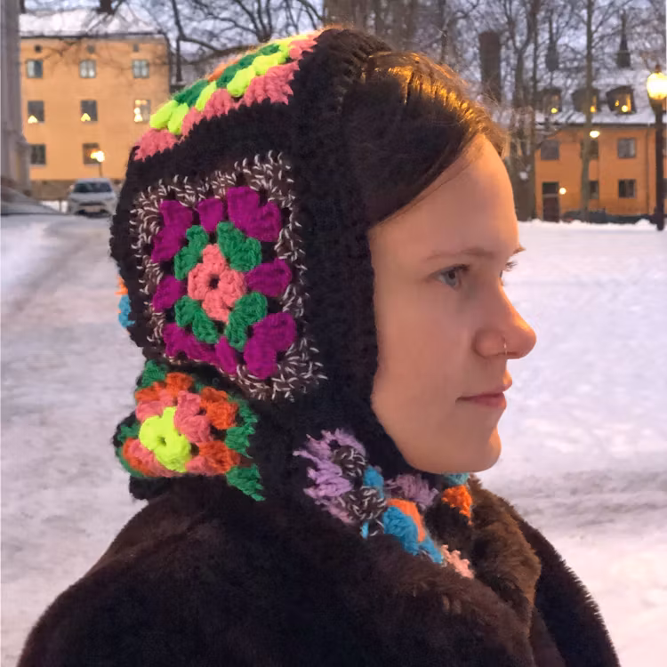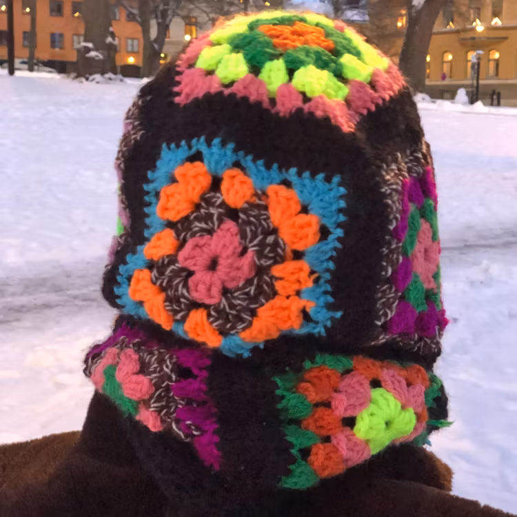 Virkad balaklava i multifärgade mormorsrutor med svart botten. Exempelbild behöver inte vara exakt den som man köper. Jag har fodrat dem med tyg från second hand kläder så den är varm och mjuk. Det är svårt med färgåtergivningen, så färgerna är klarare och lite starkare i verkligheten. Balaklavan på modellen är min privata. Varje balaklava är unik och i endast 1 ex av varje, det finns 3 st.