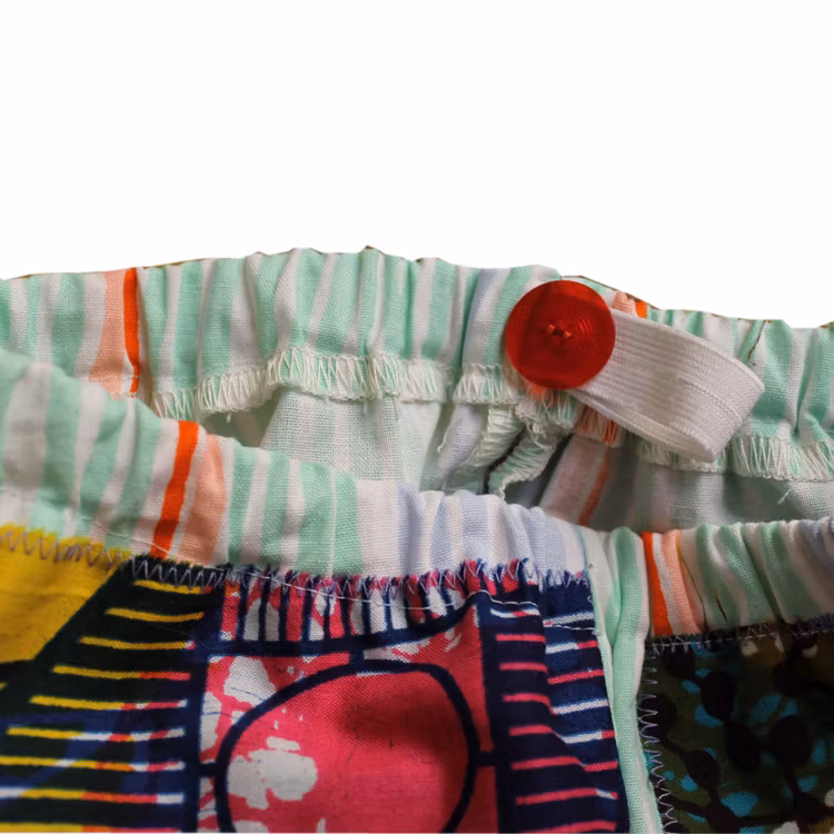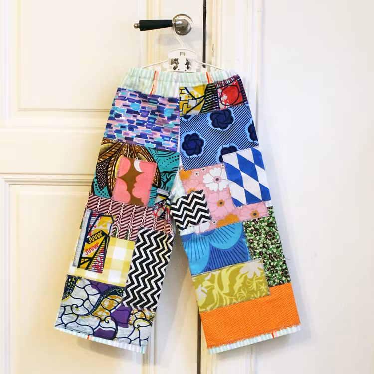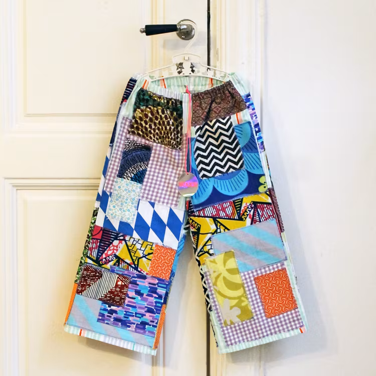 Unik byxa i lappteknik med påsydda lappar från secondhand/afrikanska tyger. Knapphålsresår för längre användning. Varje plagg är unikt och byxan är snygg även i en lite kortare modell, så den passar bra genom olika åldrar. Hållbart mode när det är som bäst, sydd med kärlek. Kolla mått för egen storleksbedömning: