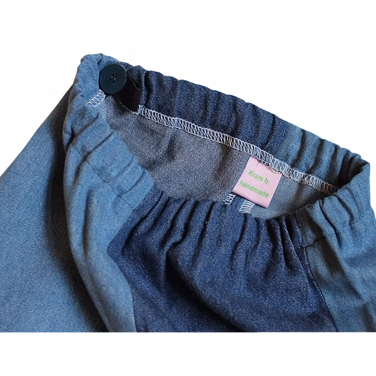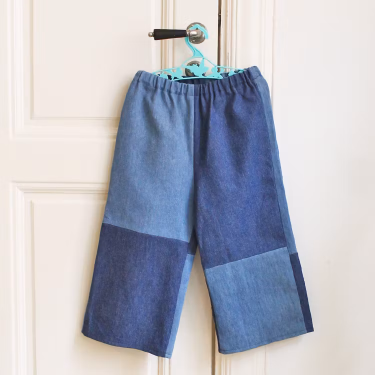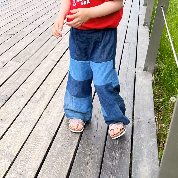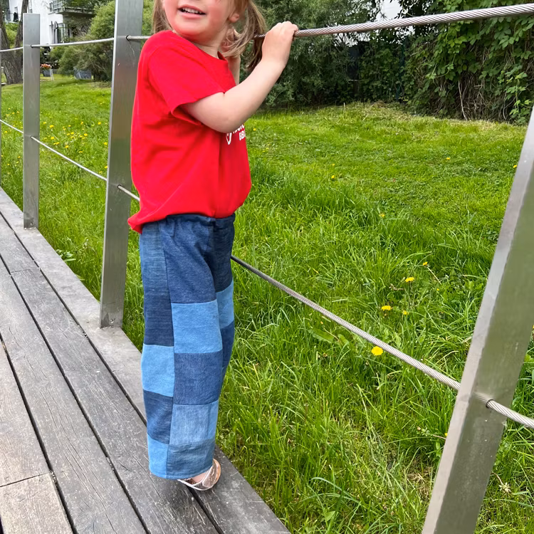 Jeansen är sydda av återbrukade, mjuka jeansskjortor och klänningar i ett lite tunnare tyg. Knapphålsresår i midjan för längre användning. Varje plagg är unikt och byxan är snygg även i en lite kortare modell, så den passar bra genom olika åldrar. Hållbart mode när det är som bäst.