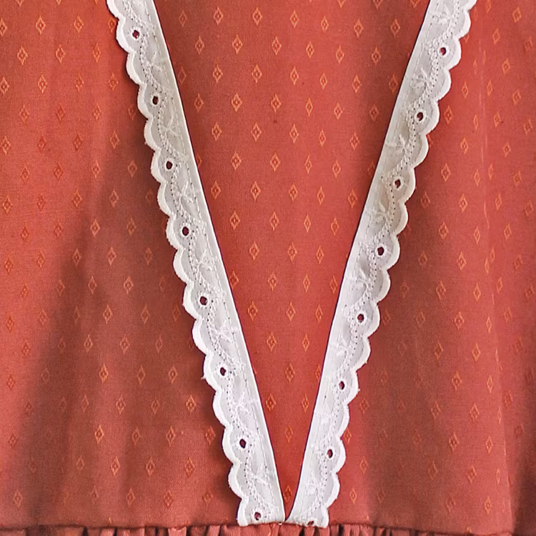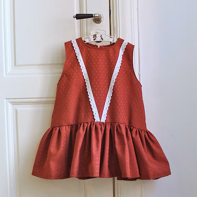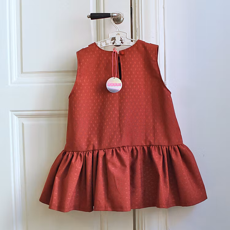 Unik klänning med volang sydd av ett secondhand tyg med ett oanvänt vintage brodyrband. Öppning bak som stängs med en knapp. Rymlig modell som funkar fint att växa i då den även blir fin som en kort klänning/tunika till byxor. Hållbart mode när det är som bäst, sydd med kärlek. Kolla måtten för egen storleksbedömning: