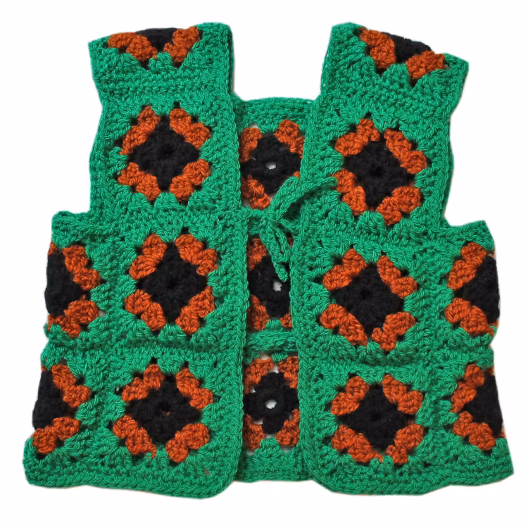 Handvirkad väst i restgarner, de flesta i ett akrylgarn som kan tvättas i 30 grader. Rekommenderar handtvätt då det kan förekomma olika material.