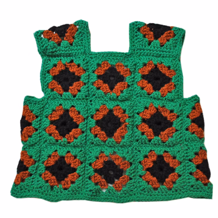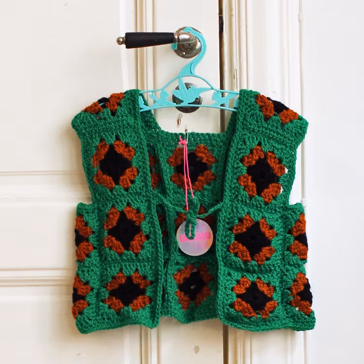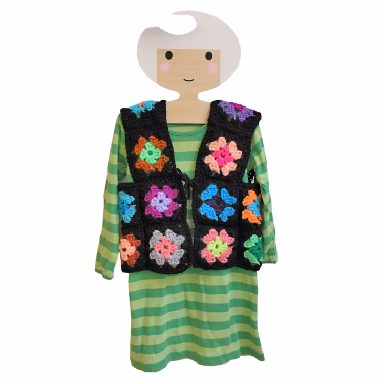 Den här västen har en grön bas med svart/ljusbruna "blommor", varje väst är unik. Jag skulle uppskatta västen att passa ca. stl. 98- 122, men kolla måtten för egen bedömning. Västen har ett knytband fram, vilket också skapar extra vidd. Supergullig till både byxor och klänning. Virkad med kärlek!