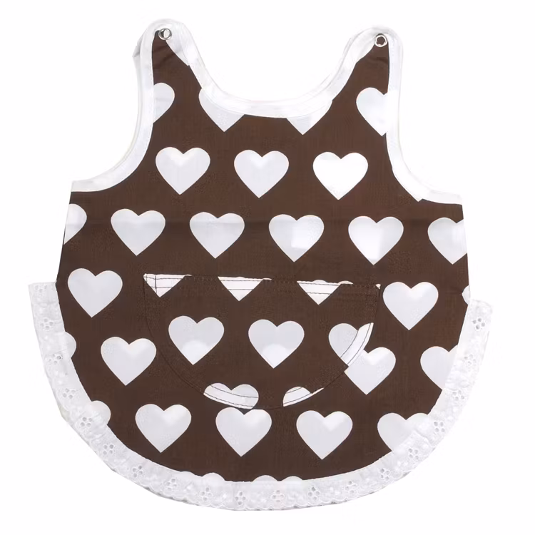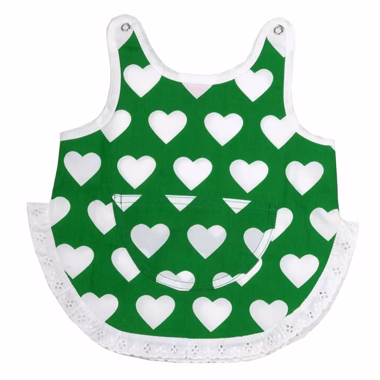 Reglerbar axelrem med två tryckknappar för längre användning. En stor ficka på magen och vitt kantband runtom. Med en vit bomullsbrodyr i nederkant. Klänningen är i en kort modell för de minsta att kunna krypa i. Passar även att använda som en liten blus till byxor när den inte längre passar som klänning, lång användningstid!
