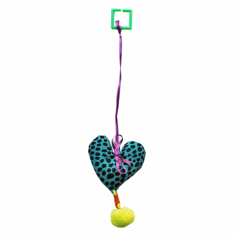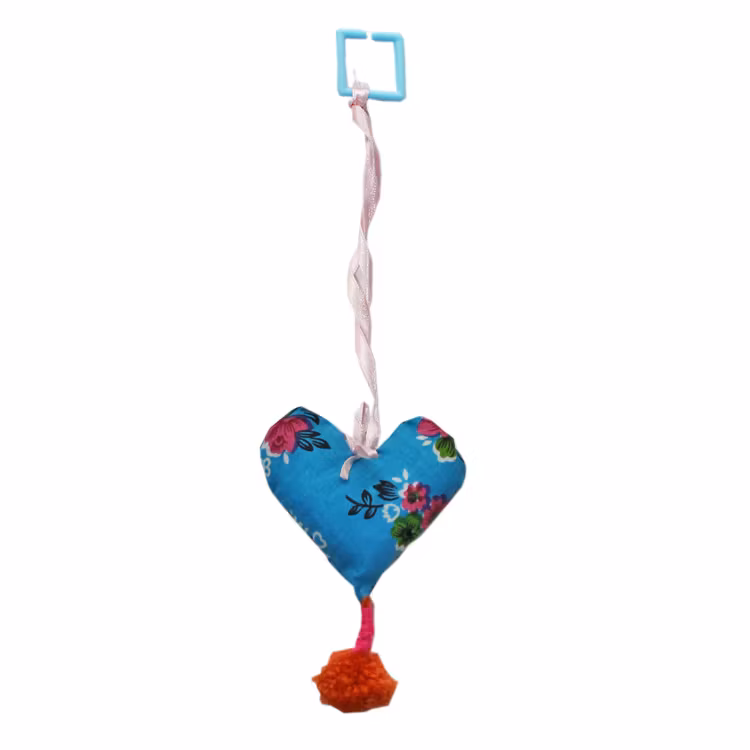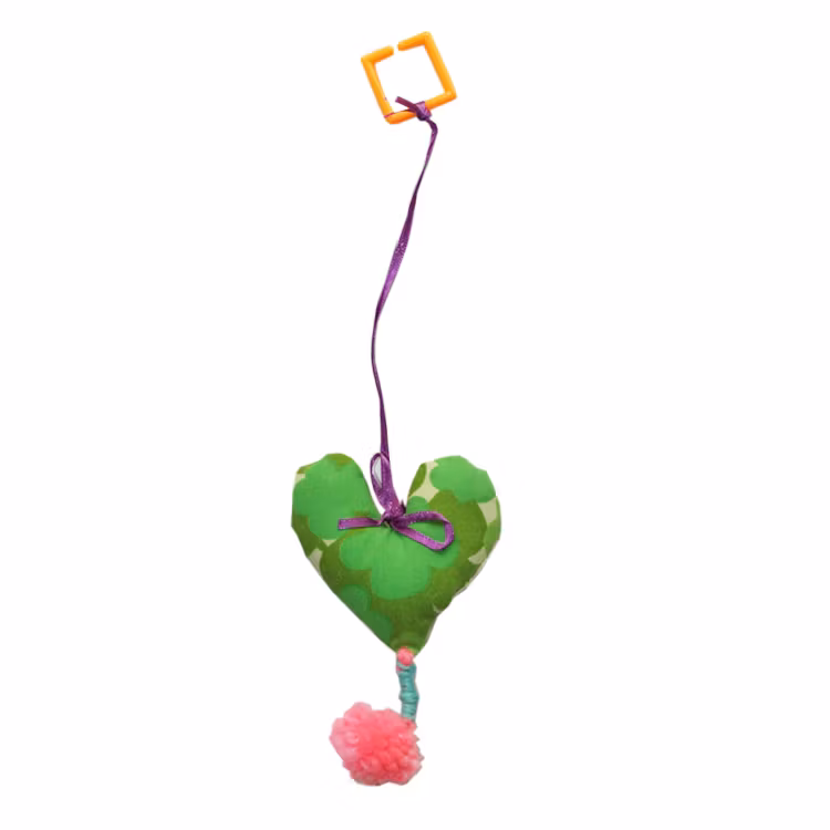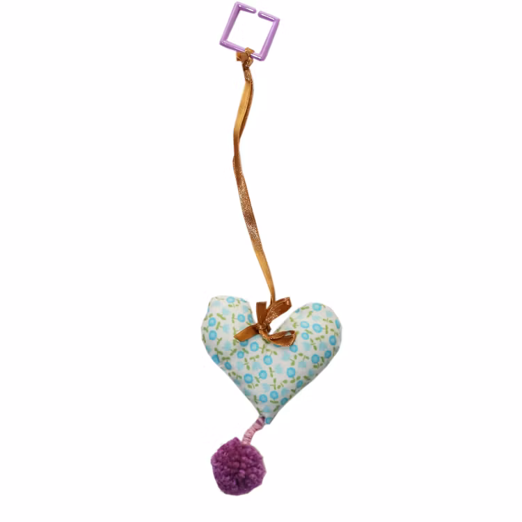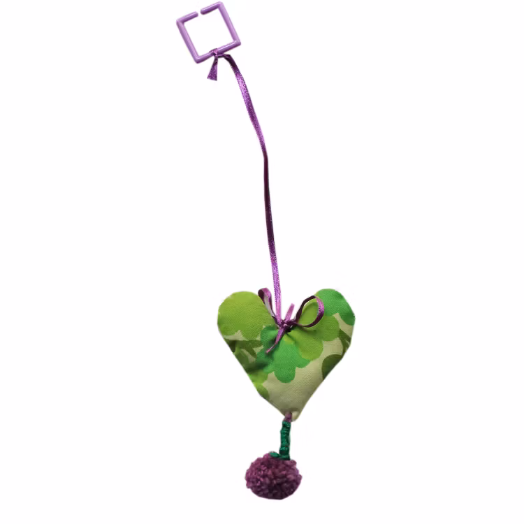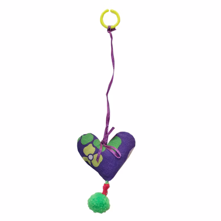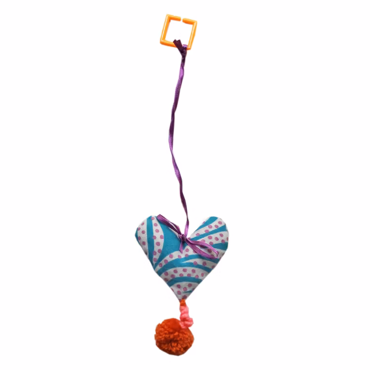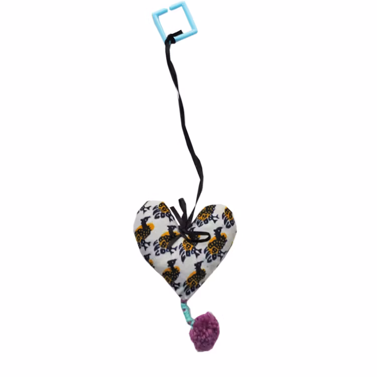 Ett handgjort barnvagnshänge ca. 29 cm långt med fästet. Vadderat hjärta sytt i retro eller afrikanska tyger. Fastsatt i ett sidenband, längs ner en liten garnboll. Varje kombination är unik och finns endast i ett ex. Går att tvätta i 30 grader.
