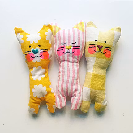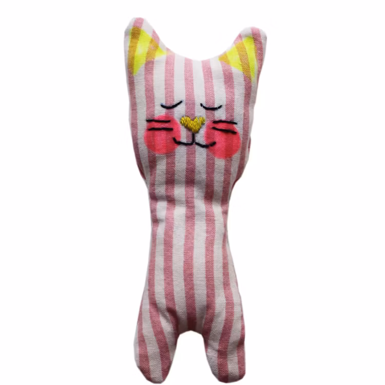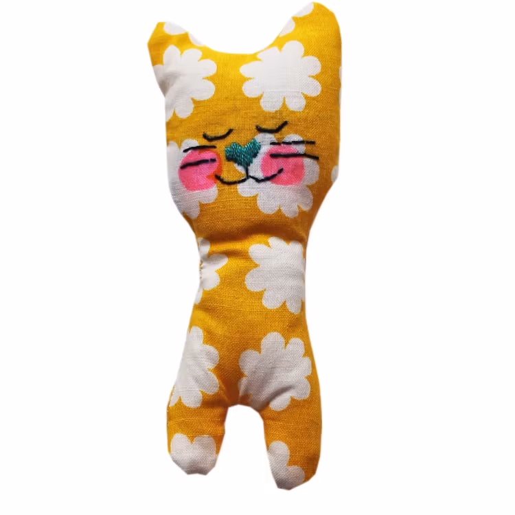 Handsydd kattskallra där varje katt är unik. Broderat ansikte där ena sidan är vaken och den andra sover. Ca. 14 cm lång, bredd huvud ca. 5 cm. Sydda av vintage tyger. Jag har använt Giotto Decor textilpennor, pennorna är vattenbaserade, giftfria och säkra. Tänk på att inte lämna baby ensam med leksak. Kolla gärna sömmar i bland. Går att tvätta i 30 grader.